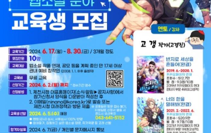 창작컨설팅 교육생 모집 포스터제천시에서 웹소설 예비 창작인의 창작 역량 강화를 위한 「창작 컨설팅(웹소설 분야) 프로그램」교육생을 오는 6월 2일까지 모집한다.교육 대상은 웹소설 작품 연재, 공모 등을 계획 중인 만 17세 이상(2008. 1. 1. 이후 출생자) 관내