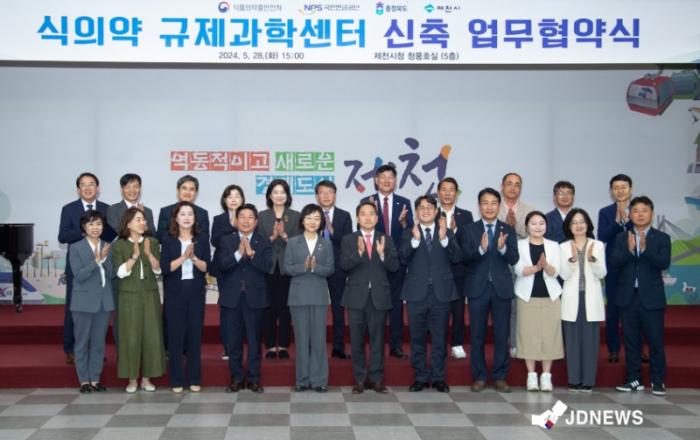 식약처 식의약 규제과학센터 유치 성공 기념사진충북 제천시가 식품의약품안전처의 전문 교육기관인 식의약 규제과학센터 유치에 성공하여 28일 김창규 제천시장과 오유경 식약처장, 김태현 국민연금공단 이사장, 김명규 충청북도 경제부지사 등이 참석한 가운데 업무협약을 체결했다고