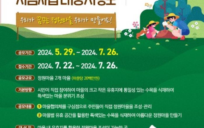 정원마을조성 모집 포스터제천시가 정원문화 확산을 위해 『시민참여형 정원마을 조성 시범사업』 참여 대상지를 모집한다.‘시민참여형 정원마을’ 조성은 시민이 주체가 되어 마을별 특성에 맞는 벚나무, 장미, 산수유 등 다양한 꽃나무를 식재함으로써 마을 전체를 정원으로 만들어