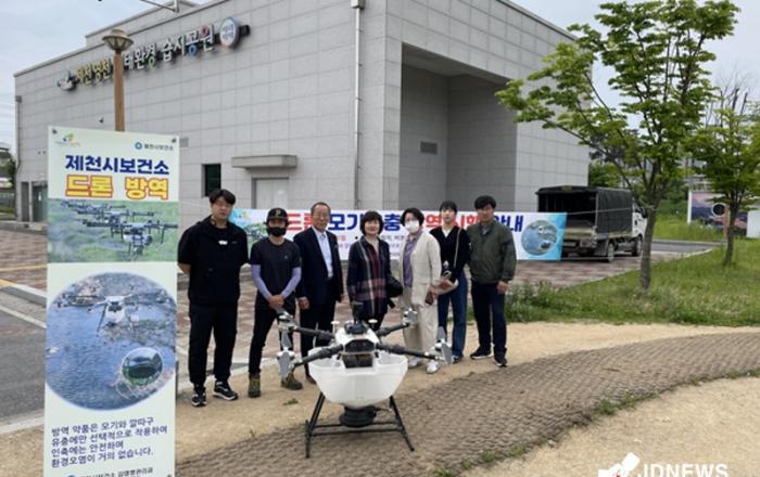 드론방역 사업 기념사진제천시보건소는 20일 비점오염 저감시설(영천동)과 솔방죽에 첫 드론방역 소독 사업을 시행하였다.드론방역 소독 사업은 비점오염 저감시설, 솔방죽, 의림지를 대상으로 순회 실시하며 2주에 1회, 총 15회에 걸쳐 시행하게 된다.올해 처음 시행하는 드론