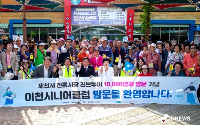 전통시장 러브투어 1만 번째 방문객 환영식 기념사진제천시는 지난 22일 한방바이오엑스포공원 내 한방마을에서 전통시장 러브투어 1만 번째 방문객 환영식을 가졌다.1만 번째 행운은 이천시니어클럽 어르신 중 한 분에게 돌아갔으며, 이날 환영식에는 김창규 제천시장과 이정임 제