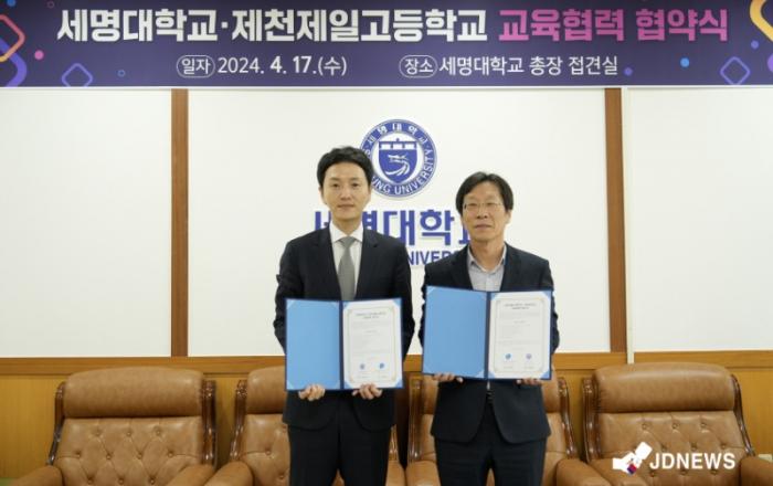 세명대학교 - 제천제일고 협약사진세명대학교(총장 권동현)과 제천제일고등학교(교장 김경태)는 교육 정보·진학 정보 교류를 통하여 양교의 교육 발전 및 성장을 도모하기 위한 교육협력 협약을 체결했다.이날 협약식에는 세명대학교 권동현 총장, 이병준 기획실장, 두경일 입학관리