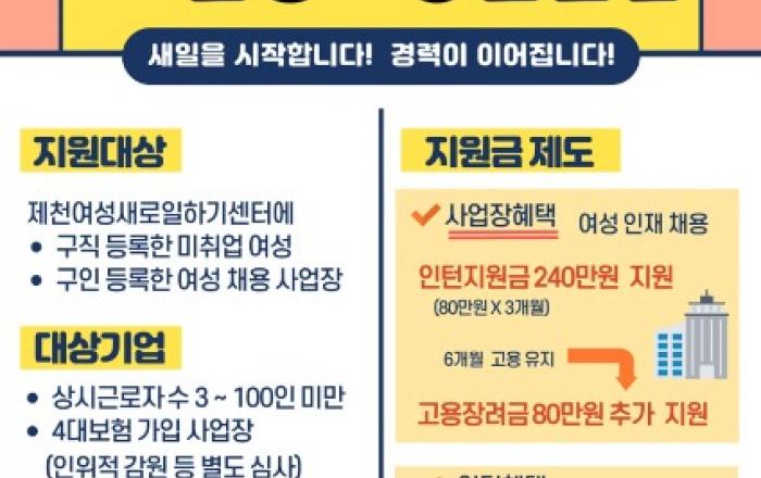 제천형 여성인턴십 포스터제천시에서는 경력단절 여성 등을 대상으로 2023년에 이어 2024년에도 “제천형여성인턴”을 운영한다고 밝혔다.제천형 여성인턴은 제천 관내 3인~100인 사업체가 신청대상이며, 제천여성새로일하기센터에 구직자로 등록되어 있는 자가 대상 사업체에 취