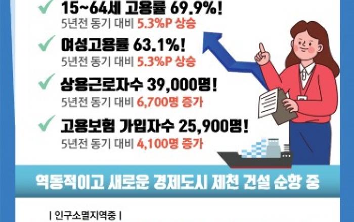 경제관련지표 카드뉴스충북 제천시가 최근 통계청에서 발표한 2023년 하반기 지역별 고용조사에서 고용률, 여성고용률, 상용근로자 수, 고용보험가입 인원 등 고용 지표와 출생률 · 국세징수액이 증가하는 등 경제 관련 지표가 꾸준히 상승하고 있다고 밝혔다.2023년 하반기