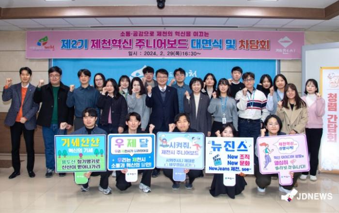 주니어보드 대면식 및 차담회 제천시는 지난 29일 제2기 주니어보드 대면식 및 간부 공무원과의 차담회를 개최했다.주니어보드는 젊은 공직자가 중심이 되어 혁신 아이디어를 발굴하고 유연한 방식의 문제 접근과 해결 등 조직의 상향식 혁신 기반을 마련하기 위한 조직이