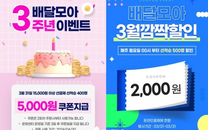 배달모아 3월 포스터제천시 공공배달앱 “배달모아”가 3주년을 맞아 특별 할인 이벤트 등을 진행한다.3월 한달동안 매주 월요일 선착순 500명에게 2천원 즉시 할인쿠폰을 제공하고,특히 3주년 당일 3월 31일에는 주문자 400명에게 5천원 특별할인 쿠폰을 지급할 예정이다