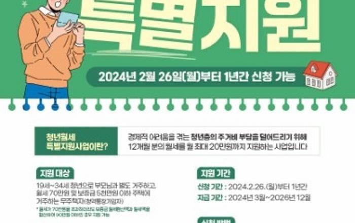 청년월세 특별지원 포스터제천시는 저소득 청년층에게 12개월간 월 최대 20만원의 임차료를 지원하는‘청년월세 특별지원사업’을 시행한다.이 사업은 고금리·고물가 등 경제여건 악화로 어려움을 겪는 청년층의 주거비 부담 경감을 위해 정부가 한시적으로 추진한다.지원대상은 부모