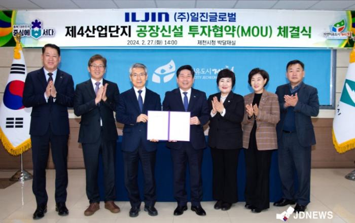▲ 일진글로벌 투자협약식제천시는 27일 제천시청에서 자동차 부품 전문기업인 ㈜일진글로벌(대표 송영수)과 제4산업단지 공장 신설 투자협약을 체결했다.이날 협약식은 김창규 제천시장, 이정임 제천시의회 의장, 일진글로벌 송영수 대표이사 등 대내·외 관계자가 참석한 가운데 진