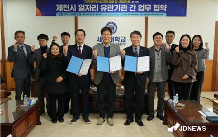 세명대는 제천시 일자리 유관기관 간 업무협약을 체결했다.세명대학교 대학일자리플러스센터(센터장 황형서)는 제천고용복지플러스센터, 제천시 일자리종합지원센터와 ‘지역정주형 일자리 발굴 및 취업지원 업무협약’을 체결했다.이번 협약에 따라 △고용친화형 교육 및 취업