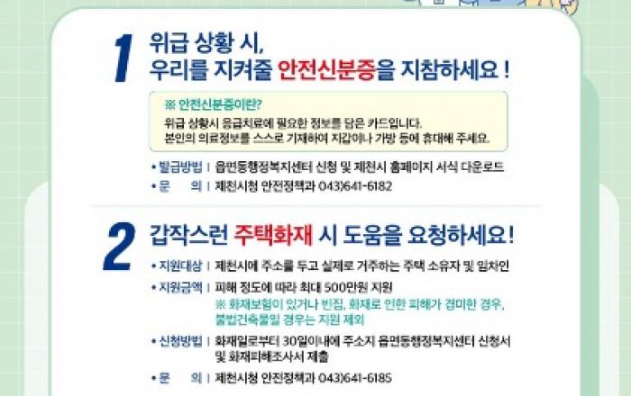 ▲ 안전안심 3종세트제천시가 2024년을 맞아 다양해지는 재난 상황에서 시민들의 재산과 생명을 보호하기 위해 ‘시민안심안전 3종 세트’를 추진한다.시민안심안전정책으로 시민안전보험과 주택화재피해지원을 계속해서 추진하며, 이에 더해 올해부터는 재난 및 사고 발생 시 신속한