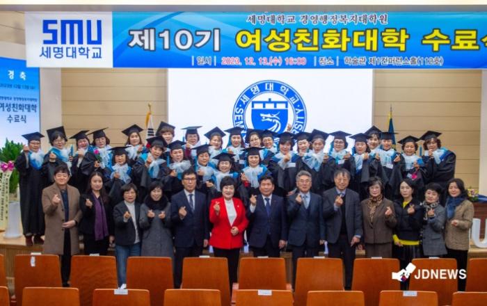 ▲ 여성친화대학 수료식제천시 ‘제10기 여성친화대학 수료식’이 13일 세명대 학술관에서 열렸다.김창규 시장, 김창한 대학원장을 비롯한 38명의 수료생 등이 참석한 가운데 진행된 이날 행사는 학사보고, 축사, 수료증 수여 및 시상 순으로 진행되었다.‘여성친화대학’은 여성