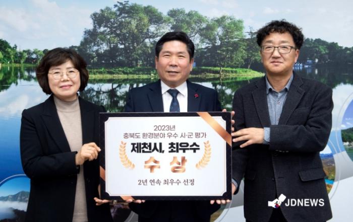▲ 제천시 충북도 환경분야 우수 시군평가 최우수 수상충북도는 2023년 환경분야 시·군 평가에서 최우수 제천시, 우수 청주시, 장려 단양군, 충주시를 선정했다고 18일 밝혔다.제천시는 2022년 최우수 수상에 이어 2023년 실적 평가에서 또다시 최우수 수상의 영예를