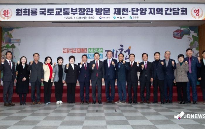▲ 원희룡 장관 간담회김창규 제천시장과 원희룡 국토교통부 장관, 엄태영 국회의원, 김문근 단양군수가 26일 간담회를 개최하고 사업현장을 직접 방문하였다. 제천시는 이번 간담회에서 ▲충북선 고속화사업의 제천역 경유 건의 ▲연금~금성 국지도 건설 조기 추진 ▲제2차 공공기