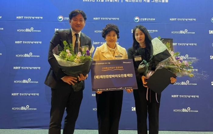 ▲ 제천한방재단 산업통상자원부 장관표창(가운데 조정희 이사장)(재)제천한방바이오진흥재단(이사장 조정희)은 28일 서울 웨스틴조선호텔에서 개최된 「2023 바이오산업의 날」행사에서 바이오특화센터 유공 우수기관으로 선정되어 산업통상자원부장관 표창을 수상했다.제천한방재단은