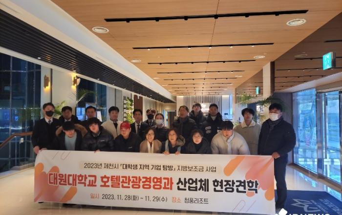 ▲ 대원대 호텔관광경영과 견학사진제천시 호텔관광경영과(학과장 안대희) 재학생들이 국민연금 공단 청풍리조트에서 산업체 견학을 실시했다.지난 28일부터 29일까지 제천시 청풍면에 위치한 청풍리조트에서 진행된 호텔관광경영과의 산업체 견학은 재학생들이 미래 호텔리어와 관광산업