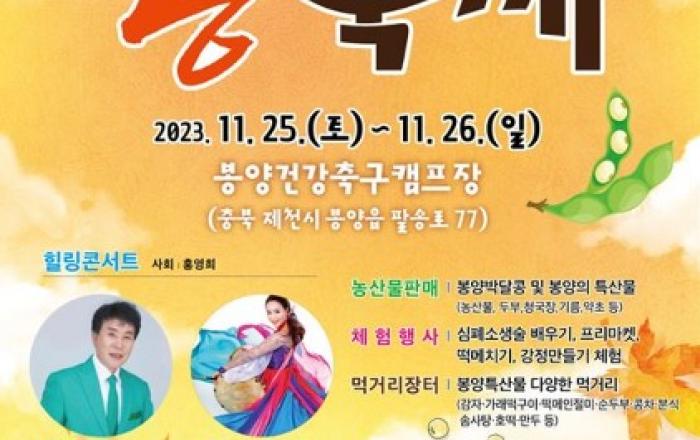 ▲ 콩축제 포스터제천시는 오는 25일부터 26일까지 봉양읍 팔송리 일원 주 무대인 건강축구캠프장에서 제4회 봉양박달콩축제(추진위원장 원정옥)를 개최한다고 밝혔다.올해로 4회째를 맞이하는 이 축제의 성공적인 개최를 위해 심혈을 기울여 축제를 준비 중에 있다.올해도 작년처