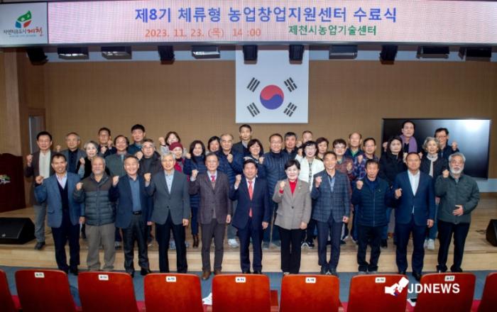 ▲ 농업창업지원센터 수료식제천시농업기술센터는 지난 23일 제천시 농업기술센터내 농업인 교육장에서 2023년 제8기 체류형 농업창업치원센터 수료식을 개최하였다.이날 열린 수료식은 김창규 제천시장과 이정임 제천시의회의장, 수료생 및 가족 등 60여명이 참석한 가운데 교육활