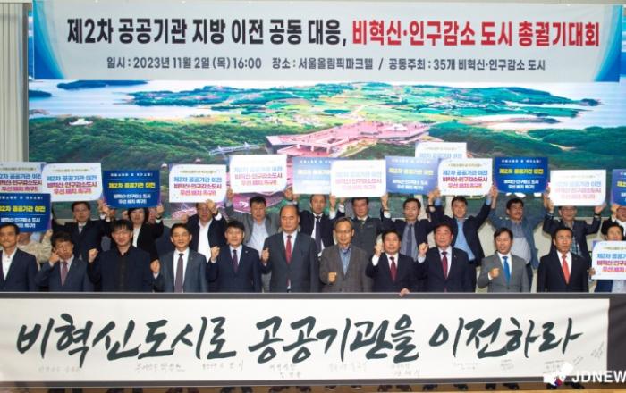 ▲ 비혁신 도시 총궐기대회제천시는 2일 서울올림픽파크텔에서 제2차 공공기관 지방이전 공동대응을 위한 비혁신·인구감소 도시 총궐기대회를 개최했다.이번 혁신도시특별법 개정 촉구 공동성명에는 국회의원(한기호,권성동,유상범,김형동,박형수,김희국,조해진,윤준병,한병도,엄태영,이