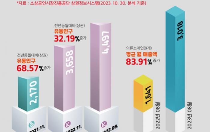 ▲ 문화관광형 시장육성사업전통시장 문화관광형 시장 육성사업을 진행하고 있는 내토시장이 소기의 성과를 드러내고 있는 것으로 나타났다.소상공인 시장진흥공단 상권정보시스템 분석에 따르면 작년 동기 대비 내토시장 유동인구는 32.19% 증가했고 반경 1㎞ 상권의 유동인구는 4