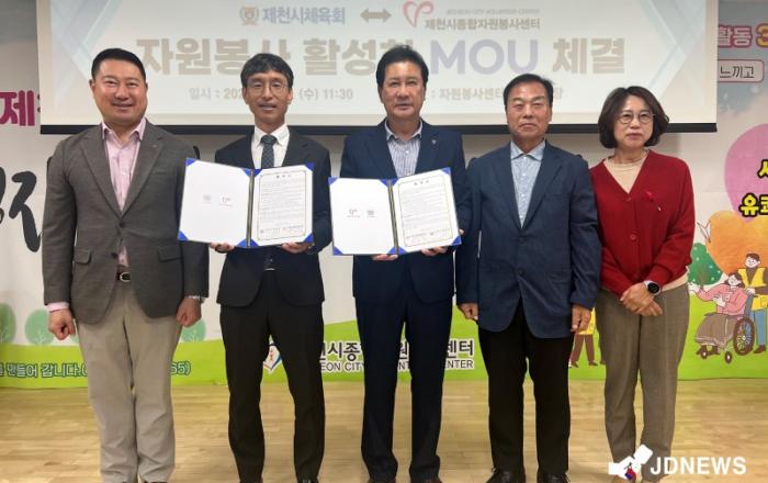 ▲ 제천시 체육회 업무협약체결제천시체육회와 제천시종합자원봉사센터가 지난 18일, 제천시종합자원봉사센터 교육장에서 제천시 체육 진흥과 자원봉사 활성화를 위한 업무협약을 체결했다.이에 따라 양 기관은 △제천시 체육 진흥 및 자원봉사 활성화 △각종 스포츠 대회 및