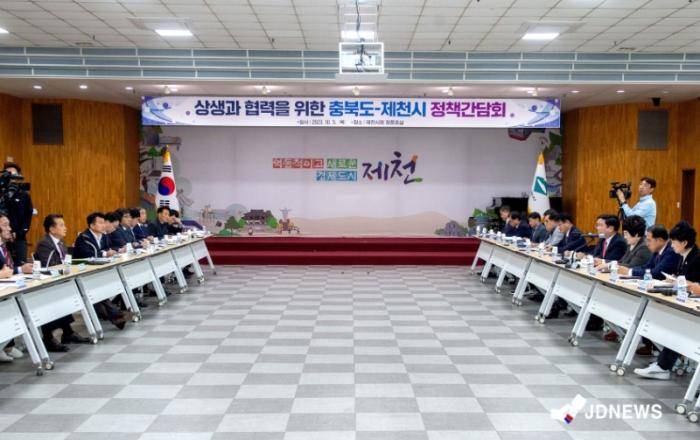 ▲ 정책감담회10월 5일 오전 8시 제천시청 청풍호실에서 충청북도(지사 김영환) 주관으로 김영환 도지사와 도 문화체육관광국장 그리고 김창규 제천시장과 채홍경 부시장을 비롯한 관계 공무원, 충북도의회 김호경, 김꽃임 의원, 제천시의회 이정임 의장과 시의원들이 참석하여 제