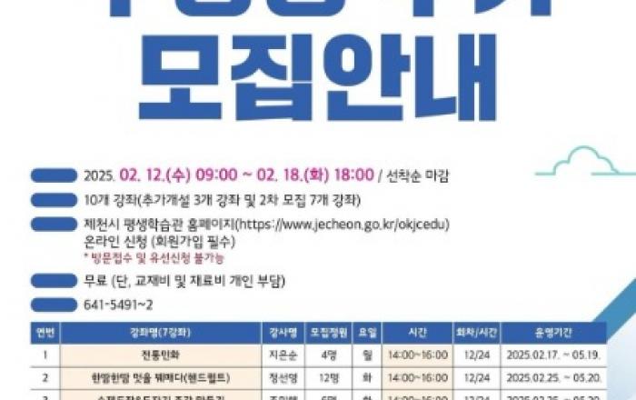 제천시가 2025년 상반기 평생학습 프로그램의 수강생을 추가 모집한다. 이번 모집은 2월 12일(수) 오전 9시부터 2월 18일(화) 오후 6시까지 진행되며, 선착순으로 마감된다.이번 프로그램에서는 기존 강좌와 더불어 새로운 강좌가 개설되었으며, 전통미술, 공예, 창작