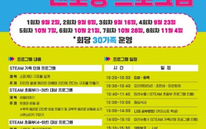 ▲ KAIST 학생들과 함께하는 가족과학체험 포스터제천시는 원도심 상권활성화사업의 일환으로 “KAIST 학생들과 제천 원도심 상권이 함께하는 가족과학체험 & 멘토링 프로그램”을 운영한다.초등학생과 그 가족을 대상으로 추진하는 이번 프로그램은 9월 2일(토) 1회