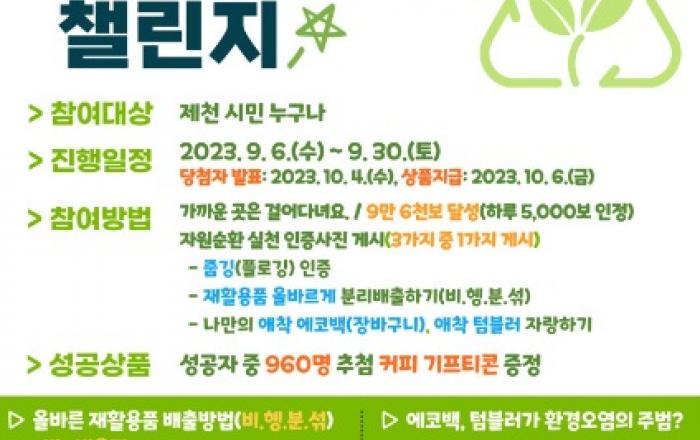 ▲ 자원순환의날 챌린지제천시는 제15회 자원순환의 날(9월 6일)을 맞아 9월 6일부터 30일까지 워크온 어플을 통해 시민 참여형 ‘9만 6천보 자원순환의 날 챌린지’를 진행한다.챌린지 참여는 보건소 걷기사업과 연계하여 진행되며, 모바일 어플 ‘워크온’을 활용해 참여할