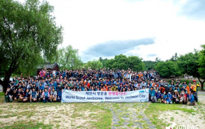 ▲ 의림지에서 잼버리 기념사진제천시는 태풍‘카눈’북상으로 새만금 세계스카우트 잼버리 대회에서 조기 퇴영한 스카우트 대원 480명이 9일 제천지역을 찾아 역사와 문화, 힐링과 레저가 있는 체험활동을 갖는다고 밝혔다.제천 방문 일정을 살펴보면 9일 오전 제천의 대표 관광지