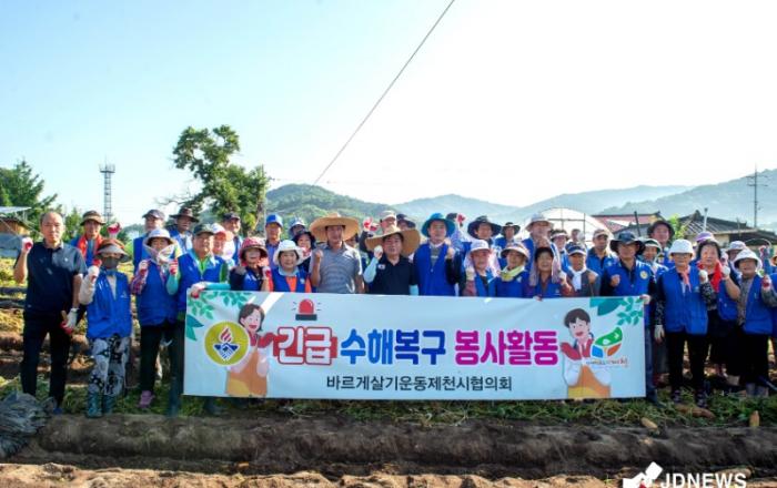 ▲ 수해복구 자원봉사제천시는 지난 13일부터 계속된 집중호우로 가옥 침수, 토사 유출 등 수해 피해 지역에 자원봉사자를 신속하게 지원하여 복구를 위해 최선의 노력을 다하고 있다고 밝혔다.수해 복구를 위해 자원봉사 수요 조사 결과 11개소(의림지동 2, 신백동 1, 송학
