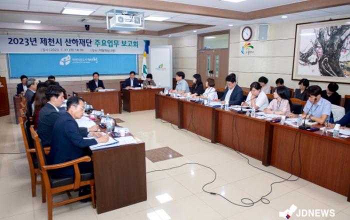 ▲ 재단 주요업무 보고회제천시는 27일 시청 박달재실에서 제천시 산하재단의 주요업무보고를 위한 회의를 개최했다.이날 회의는 김창규 제천시장, 지중현 인재육성재단 이사장, 김상수 문화재단 이사장, 유용식 복지재단 이사장, 조정희 한방바이오진흥재단 이사장 등 재단 상임이사