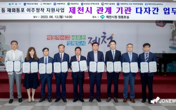 ▲ 제천시 8개기관과 고려인 등 재외동포 이주정착에 뜻 모아 제천시와 지역 8개 기관은 12일 시청 청풍호실에서 재외동포의 주거․교육․일자리․의료 등 전방위적인 지원체계를 확립하기 위한 다자간 업무협약을 체결했다.이번 협약으로 시는 지역기관과 뜻을 모아 청년층