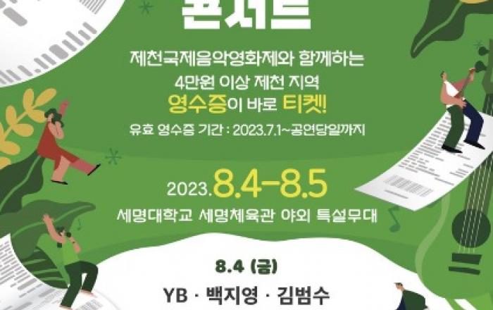 ▲‘제천국제음악영화제 with 영수증콘서트’제천시가 오는 8월 4일, 5일 양일간 제천 세명대학교 세명체육관 야외 특설무대에서 ‘제천국제음악영화제와 함께하는 영수증 상생콘서트’를 개최한다. 이번 콘서트는 2023 제천국제음악영화제(8.10.~15. 6일간) 시작을