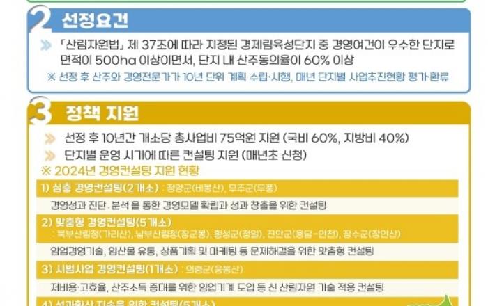 산림청은 선도 산림경영단지의 경영성과 창출 및 운영개선을 위해 전국 13개 선도 산림경영단지를 대상으로 컨설팅을 실시한다고 25일 밝혔다. ‘선도 산림경영단지’는 산림청장이 지정한 경제림육성단지 중 경영 여건이 우수한 곳을 대상으로 공모해