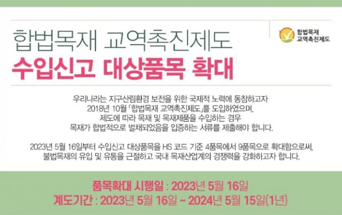 산림청은 목재제품 수입 시 목재가 합법적으로 벌채되었음을 증명하는 서류를 제출해야 하는 대상품목이 5월 16일부터 펄프(pulp), 파티클보드(particleboard), 섬유판, 성형목재, 단판으로 확대된다고 밝혔다. 합법벌채 수입신고제도는 불법벌채로 인한 산림파괴를