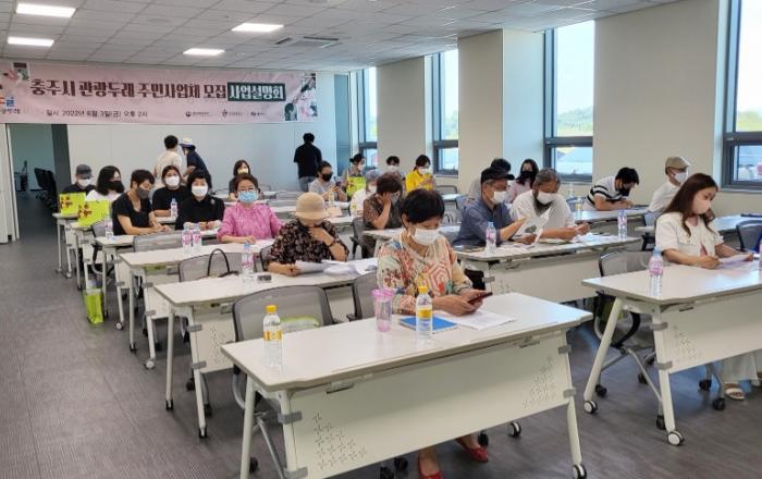 ▲ 관광두레 사업설명회 개최충주시 관광두레는 3일 충주시 칠금동에 위치한 유네스코 국제무예센터에서 주민사업체 모집 사업설명회를 가졌다.이번 설명회는 식음료 체험, 숙박 등 관광사업 창업과 경영개선에 관심이 있는 주민을 대상으로 관광두레 사업의 취지와 목적을 안내하고 주