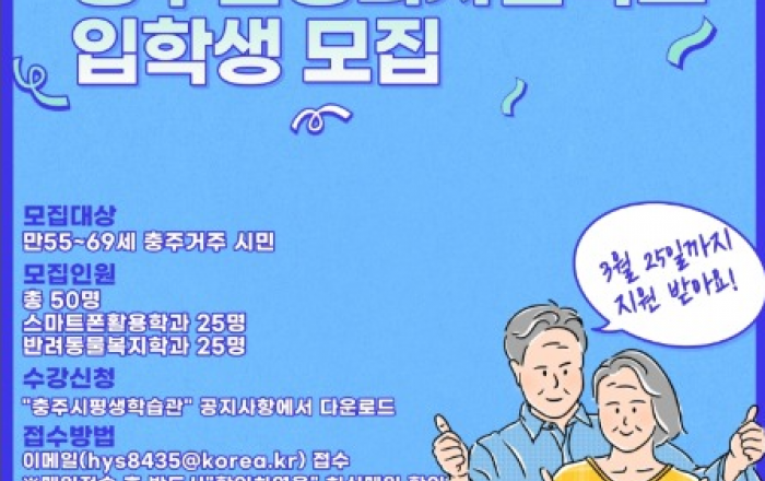 충북 충주시는 오는 3월 25일까지 중장년들의 제2의 인생 설계를 위한 '2022년 충주인생디자인학교 수강생'을 모집한다고 10일 밝혔다.충주인생디자인학교는 고령화 시대 5060세대들의 삶의 경험을 평생학습과 접목해 은퇴 전·후 불안감 극복과 학습형 일자리 창출, 사회