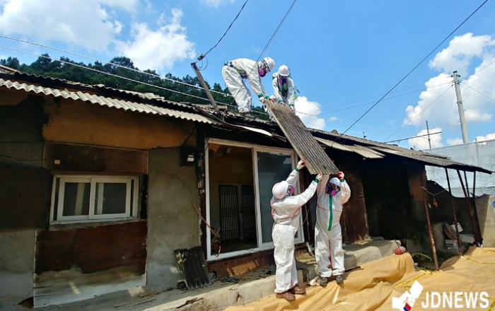 ▲ 슬레이트 철거하는 모습충북 충주시는 슬레이트에 함유된 석면으로부터 시민의 건강을 보호하고 쾌적한 환경을 조성하기 위해 ‘2022년 슬레이트 처리 및 개량 지원사업’을 추진한다고 8일 밝혔다.지원대상은 슬레이트 건축물로 주택(부속 건축물 포함) 295동과 비주택(창고