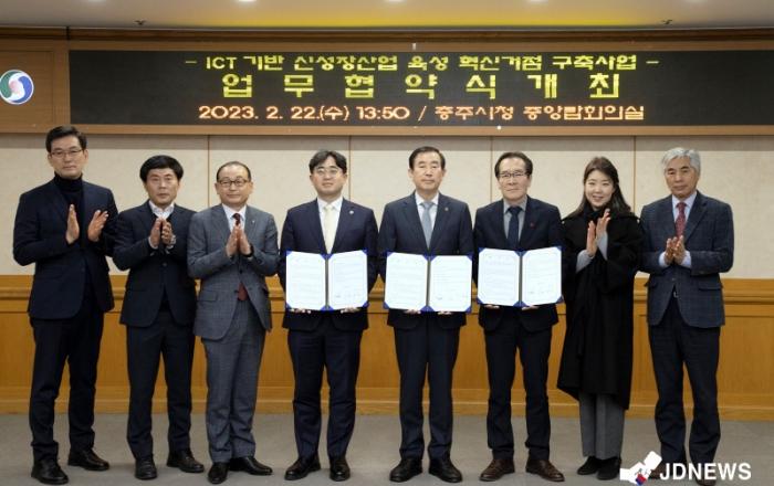 ▲ ICT기반 제조산업 혁신 본격 행보충주시는 22일 ‘ICT 기반 신성장산업 육성 혁신거점 구축사업’의 본격 추진을 위해 충청북도, 충북과학기술혁신원과 업무협약을 체결했다고 밝혔다.이날 협약식에는 조길형 충주시장, 김명규 충북도 경제부지사, 김상규 충북과학기술혁신원장