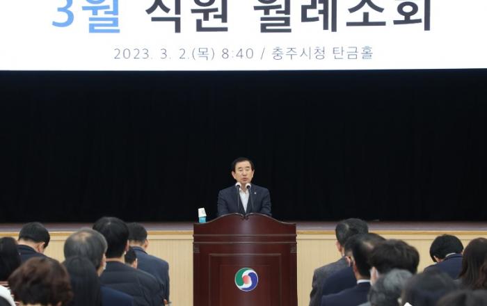 ▲ 3월 월례조회조길형 충주시장이 트렌드를 읽는 업무 방향성을 제시했다.조 시장은 2일 시청 탄금홀에서 진행된 3월 직원 월례조회에서 “주민과의 대화를 지난 28일로 마쳤다”며 시민들의 관심사를 전달했다.그는 “시민들이 원하는 것은 새로운 것을 개발하기 보다 기존 시설