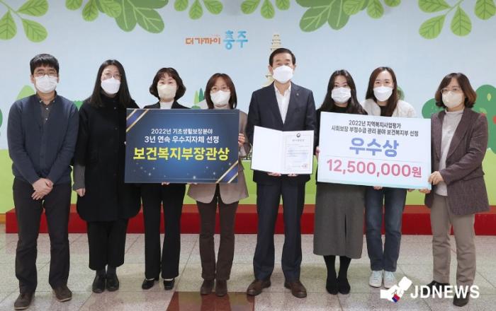 ▲ 지역복지사업평가 5년연속 수상보건복지부가 전국 지자체를 대상으로 실시하는 각종 평가에서 충주시가 수상하는 겹경사를 맞았다.시는 ‘2022년 지역복지사업평가’사회보장 부정수급 관리 분야에서 5년 연속 수상에 이어 ‘2022년 기초생활보장분야’에서 3년 연속
