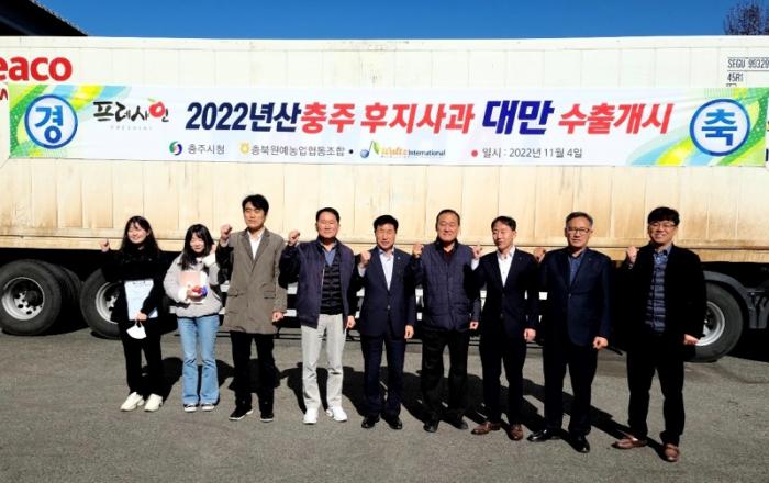 ▲ 수출선적식충주시는 올해로 12년째 사과를 대만으로 수출하는 쾌거를 달성했다.충북원예농협 충주거점산지유통센터는 7일 최근 2022년산 후지사과 20톤을 선적해 대만 수출을 시작한다고 밝혔다. 이번에 수출되는 충주사과는 타이페이 제1도매시장에서 판매될 예정이다. 올해