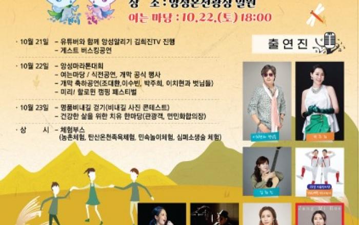 ▲ 앙성탄산온천축제충주시는 ‘비내섬과 함께하는 앙성탄산온천축제’를 오는 21일부터 23일까지 3일간 충주시 앙성면 앙성온천광장 일원에서 개최한다고 밝혔다.앙성온천관광협의회(회장 박진용) 주관으로 개최되는 올해 축제는 거리두기 해제 이후 3년 만에 열린다.21일 저녁 유