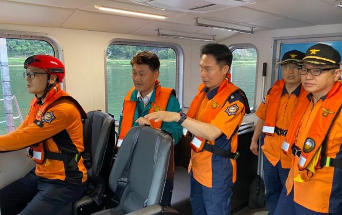 오영탁 도의원이 단양수난구조대원과 소방정에 탑승해 주요 수계구역 시찰과 수난구조장비를 확인하고 있다. 단양소방서는 27일 오영탁 충북도의원이 소방공무원들을 격려하기 위해 단양 수난구조대를 방문했다고 밝혔다.이날 수난구조대를 방문한 오영탁 도의원은 주요업무를 보고받고