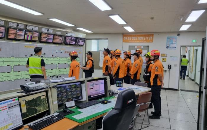 단양소방서 대원들이 죽령터널 상황실에서 터널 현황에 대해 설명을 듣고 있다.단양소방서(서장 채열식)는 9월 3일 오후 죽령 터널, 지하 대공간 등 현지 적응 훈련을 실시했다고 밝혔다.이번 훈련은 2024년 지하대공간 화재안전특별관리 추진계획에 따라, 화재 시 대규모