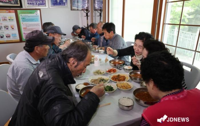 공동급식소에서 식사하는 농업인단양군은 지난 1일 외중방리에서 농번기 마을공동급식소 개소식을 개최했다.군은 고양이 손도 빌린다는 바쁜 농번기에 여성농업인의 가사 부담을 줄이고 마을 공동체를 활성화하기 위해 10개 마을에 6,000만 원을 지원한다.농번기 마을공동급식 운영