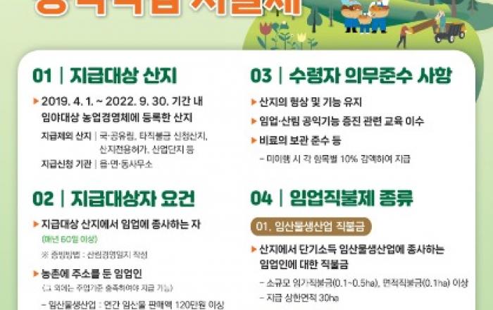 임업직불금 홍보 포스터단양군은 2024년 임업·산림 공익직불금을 오는 30일까지 접수한다.임업직불금은 올해 시행 3년 차로 2019년 4월 1일부터 2022년 9월 30일까지 임업경영체 등록을 완료한 산지에서 일정 자격을 갖추고 준수사항을 이행한 임업인에게 직불금을 지
