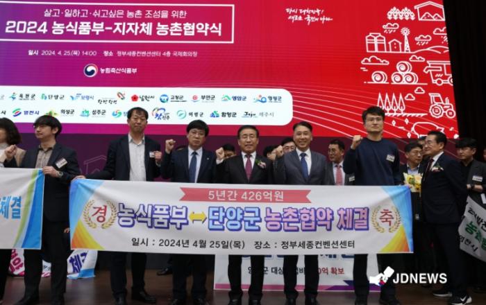 농촌협약 체결 충북 단양군이 농촌 활성화에 새 지평을 연다.군은 25일 정부세종컨벤션센터에서 농림축산식품부와 향후 5년간 진행될 농촌협약을 체결했다.이번 협약은 지난해 군이 농식품부에서 추진하는 ‘2023년 농촌협약’ 공모사업에 선정돼 이뤄졌다.이 사업은 농촌