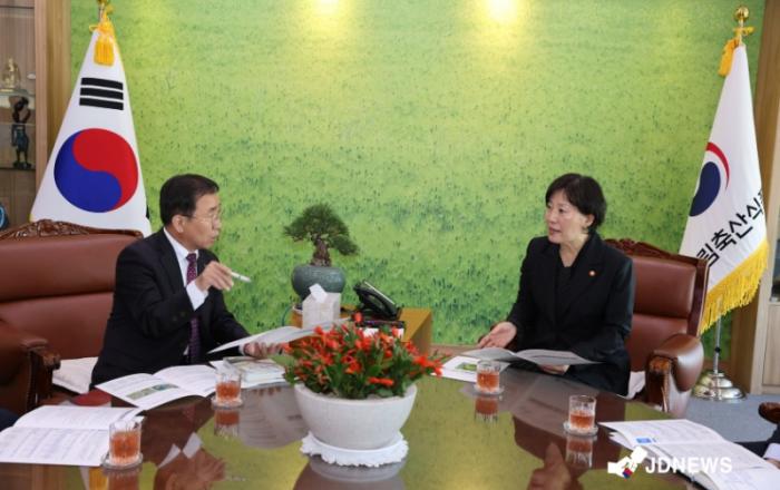 송미령 장관에게 현안 사업을 건의하는 김문근 군수김문근 단양군수는 25일 농촌협약식 이후 송미령 농림축산식품부 장관을 별도로 만나 지역 현안을 건의했다.이날 김 군수는 지역 농민들의 숙원인 국립농산물품질관리원(이하 농관원) 단양사무소 신설과 농작물재해보험에