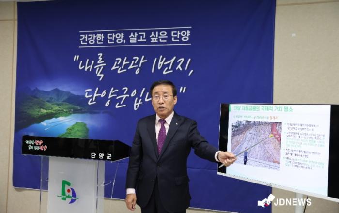 김문근 군수 단양의 미래 정책에 대해 브리핑하고 있다.충북 단양군이 대한민국 내륙 관광 1번지 시대로 가기 위한 해법들을 내놓았다.김문근 단양군수는 30일 단양군청에서 기자회견을 열고 “단양의 관광 패러다임을 혁신하고 ‘내륙 관광 1번지 단양’을 향해 한 단계 더 도약